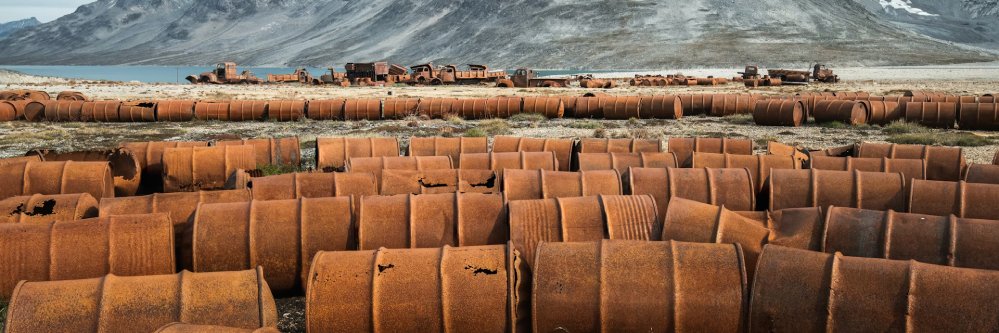 Butoaie de combustibil ruginite și vehicule abandonate la o fostă bază americană din Groenlanda, datând din cel de-Al Doilea Război Mondial. Credit: Posnov/Moment via Getty Images