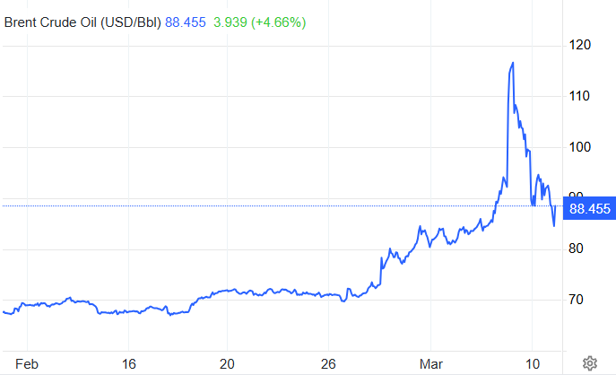 Țițeiul european Brent a coborât la aproximativ 88,5 dolari pe baril, după ce atinsese aproape 120 de dolari. Petrolul american de referință, West Texas Intermediate (WTI), a scăzut marți până în jur de 80–84 de dolari pe baril. În sesiunea precedentă urcase, de asemenea, aproape de 120 de dolari, pe fondul temerilor că războiul ar putea bloca transportul petrolului din Orientul Mijlociu.