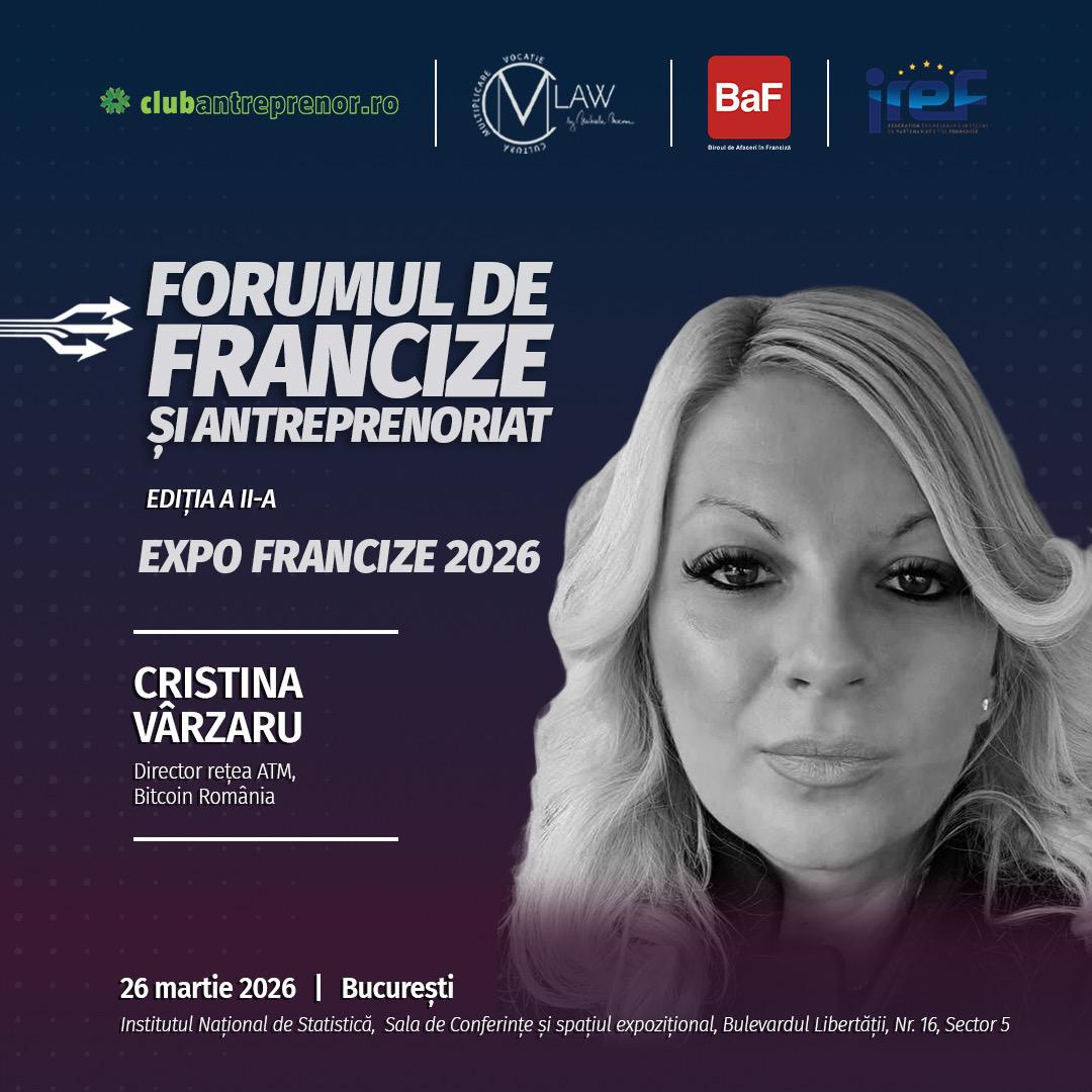 Cristina VĂRZARU, Director al rețelei de ATM-uri din cadrul Bitcoin România, va participa în calitate de vorbitor la Forumul de Francize și Antreprenoriat, ediția a II-a, organizat pe 26 martie 2026, la Institutul Național de Statistică (INS), în București.