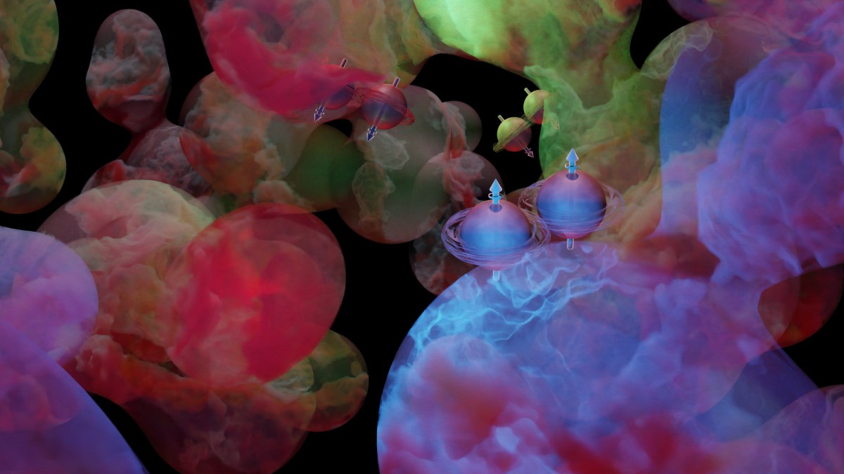 Imaginea ilustrează fluctuațiile dinamice ale câmpurilor de energie din vidul cuantic asociate perechilor quarc–antiquarc cu spinul aliniat.Credit: Valerie A. Lentz/Brookhaven National Laboratory