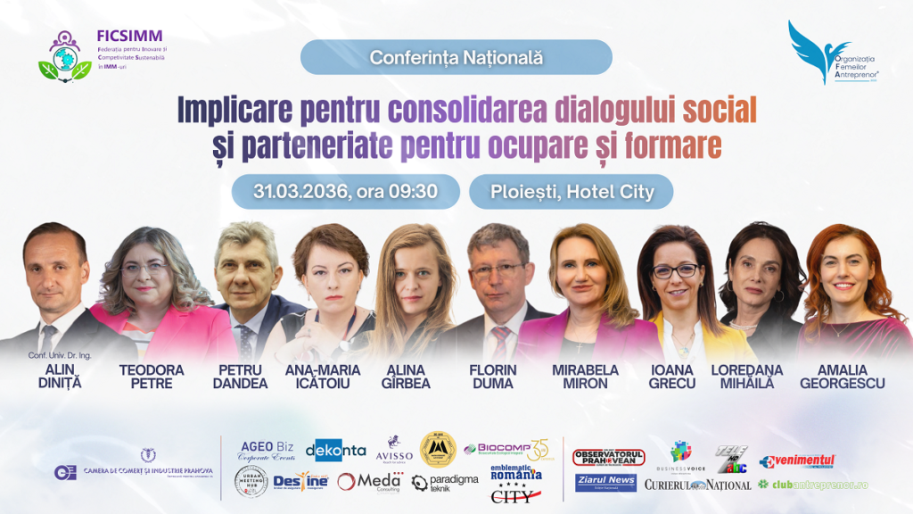 Federația pentru Inovare și Competitivitate Sustenabilă în IMM-uri (FICSIMM) și Organizația Femeilor Antreprenor (OFA) au plăcerea de a anunța organizarea conferinței regionale „Implicare pentru consolidarea dialogului social și parteneriate pentru ocupare și formare”, un eveniment dedicat întăririi cooperării între actorii economici, sociali și instituționali, în contextul transformărilor profunde ale pieței muncii și al necesității de politici publice mai eficiente.
