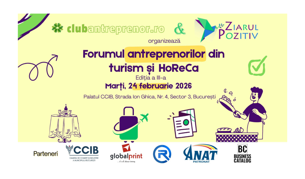 Club Antreprenor și Ziarul Pozitiv, entități dedicate promovării excelenței educaționale și a dezvoltării sustenabile, au deosebita plăcere de a vă invita la cea de-a treia ediție a Forumului Antreprenorilor din Turism și HoReCa. Evenimentul se va desfășura marți, 24 februarie 2026, în cadrul prestigiosului Palat al Camerei de Comerț și Industrie București (CCIB), situat în Str. Ion Ghica, Nr. 4.