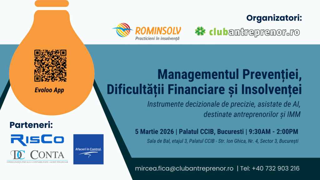RomInsolv și Club Antreprenor organizează joi, 5 martie 2026, evenimentul cu tema Managementul prevenției, dificultății financiare și insolvenței – Instrumente decizionale de precizie, asistate de AI, destinate antreprenorilor și IMM.