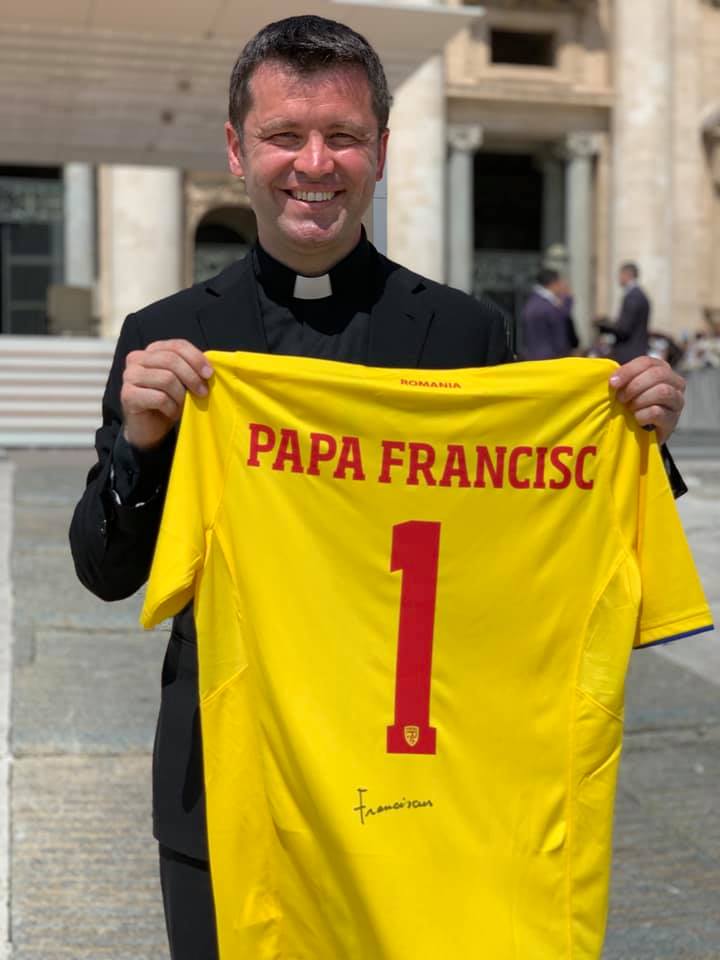 Concret, părintele Francisc Doboș a avut ocazia să stea lângă Papa Francisc și să-i ofere acestuia un tricoul al naționalei României pe care l-a semnat. Pe spate apărea numele fostului lider de la Vatican, dar și