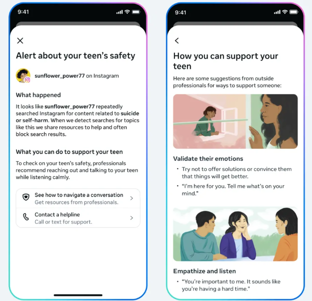 Instagram a anunțat că va începe să-i informeze pe părinții care au activată funcția de supraveghere, dacă copiii lor încearcă să acceseze conținut legat de autovătămare sau sinucidere. Aceștia vor fi contactați prin e-mail, SMS, WhatsApp sau prin Instagram, fiind folosite funcțiile de datele pe care Meta le are de la membrii familiei. Alertele vor fi trimise, începând de săptămâna viitoare, în SUA, Marea Britanie, Canada și Australia, și vor fi apoi implementate și în restul țărilor. Nu a fost oferit un orizont clar în ceea ce privește perioada de implementare