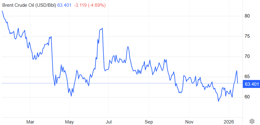 Cotația țițeiul european Brent scade cu -4,7%, până la 63,4 dolari pe baril, în timp ce petrolul american WTI s-a depreciat cu -4,9%, până la 59 de dolari pe baril. Donald Trump a declarat, miercuri seară, în timpul unei discuții cu presa în Biroul Oval, că a primit asigurări că autoritățile iraniene nu vor executa cetățenii reținuți în timpul reprimării violente ale protestelor din ultimele săptămâni. Tot miercuri, SUA au început retragerea unei părți din personalul din bazele militare-cheie din Orientul Mijlociu.