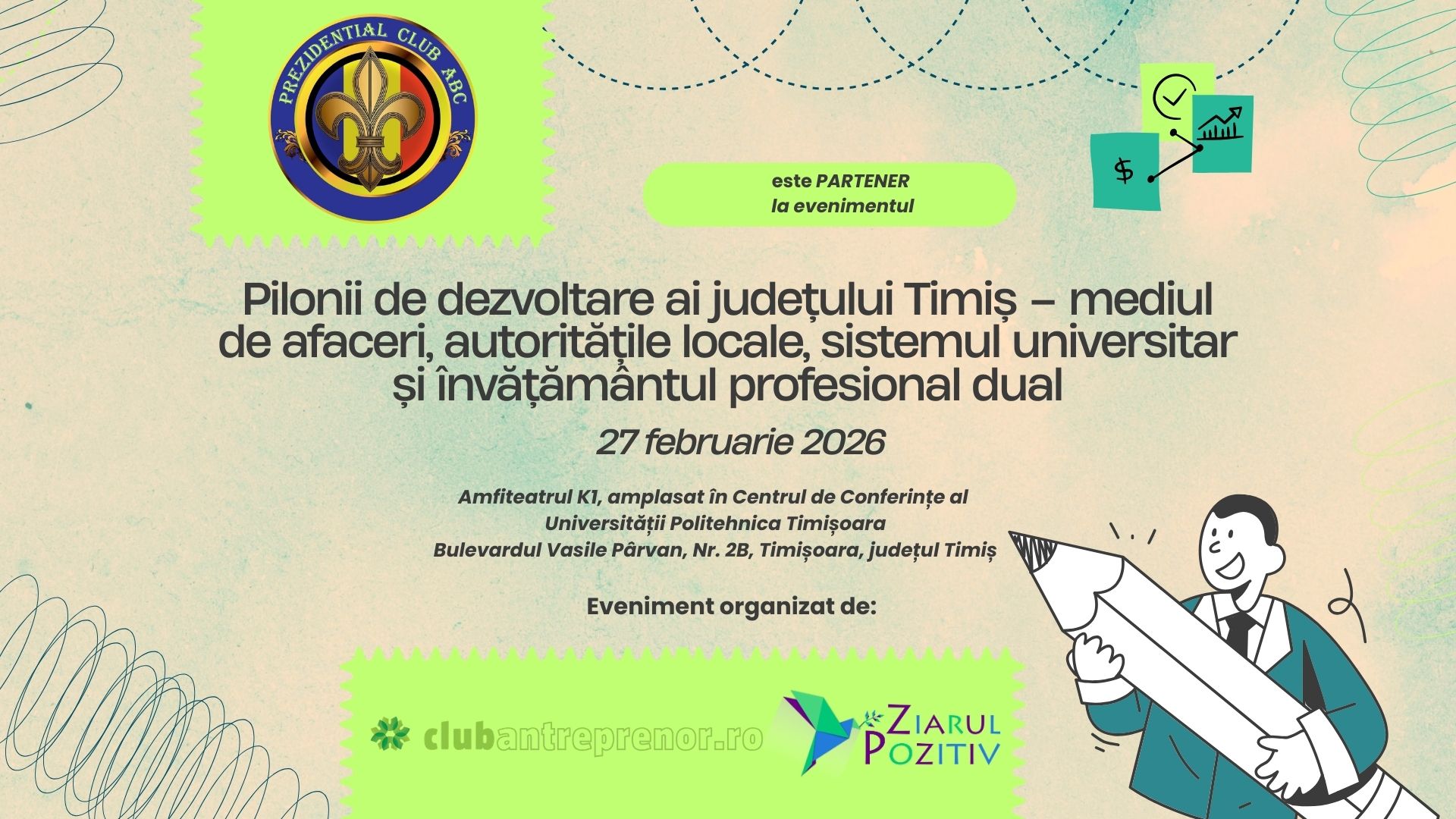 În acest context, Prezidențial Club ABC se alătură evenimentului „Pilonii de dezvoltare ai județului Timiș”, consolidând dimensiunea strategică a dialogului dintre mediul de afaceri, autorități și sistemul universitar.