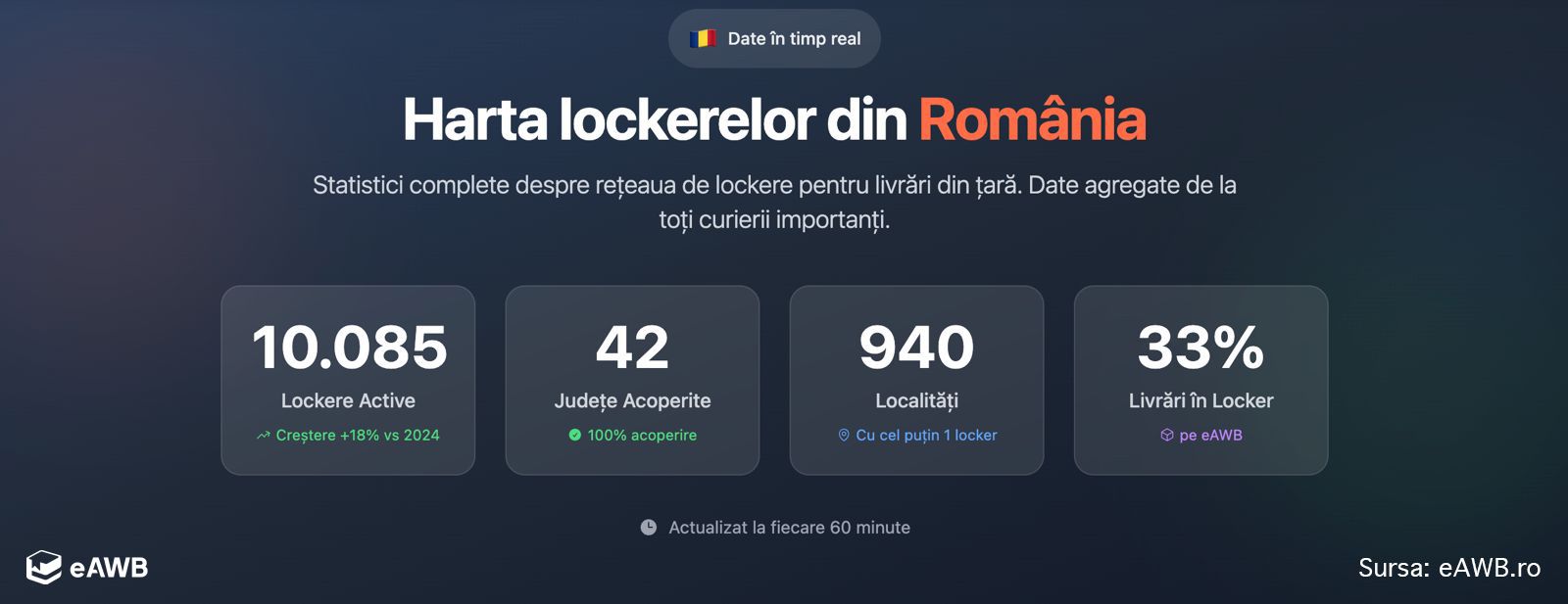 Rețeaua de lockere din România se extinde într-un ritm accelerat, ajungând la cea mai ridicată capacitate de până acum înainte de perioada de Crăciun, când comerțul online înregistrează cel mai mare volum de comenzi din an. Conform datelor furnizate de eAWB – marketplace de servicii de curierat, care agregă informații de la toți curierii importanți din țară, infrastructura națională cuprinde puțin peste 10.000 de lockere active, cu 33% mai multe decât în 2024, acoperind toate cele 42 de județe și un total de 940 de localități.