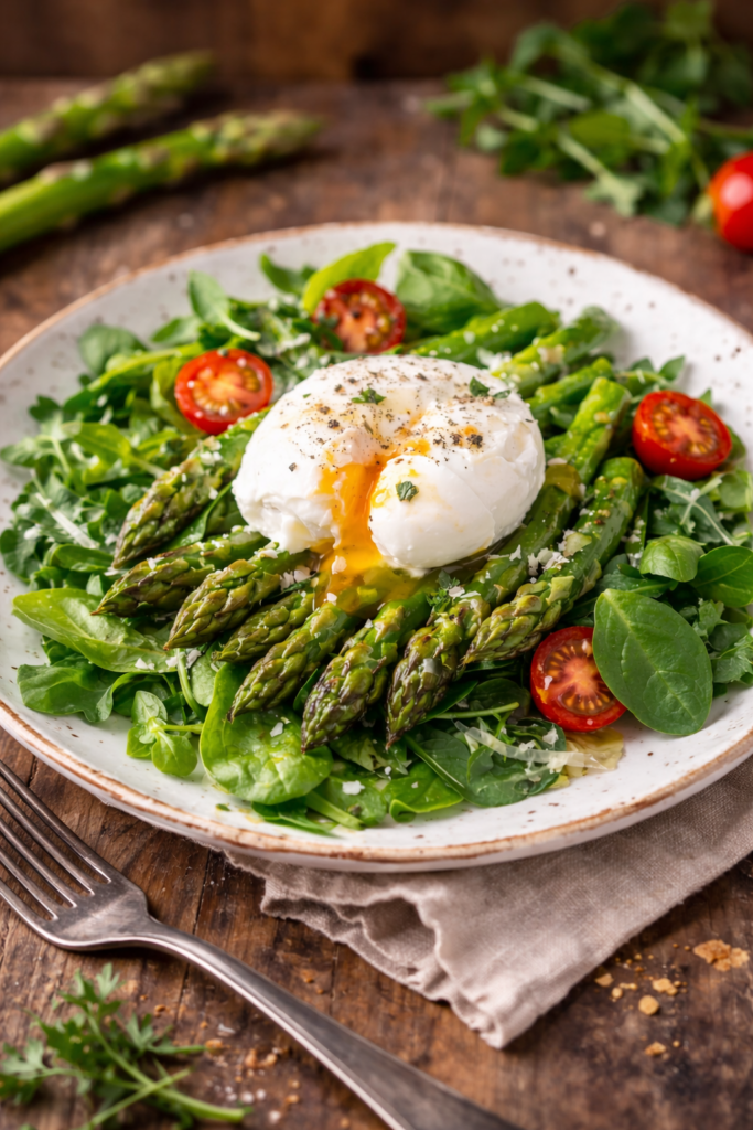 Salată de primăvară cu sparanghel și ou poșat – prospețime și savoare în farfurie