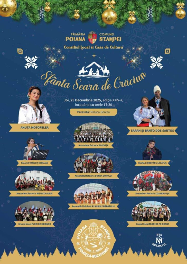 Comuna Poiana Stampei va fi, și în acest an, gazda unuia dintre cele mai așteptate evenimente culturale din Țara Dornelor, dedicat sărbătorii Nașterii Domnului. Joi, 25 decembrie 2025, începând cu ora 17.30, va avea loc cea de-a XXIV-a ediție a manifestării „Sfânta Seară de Crăciun”, un eveniment devenit deja o tradiție pentru comunitatea locală.