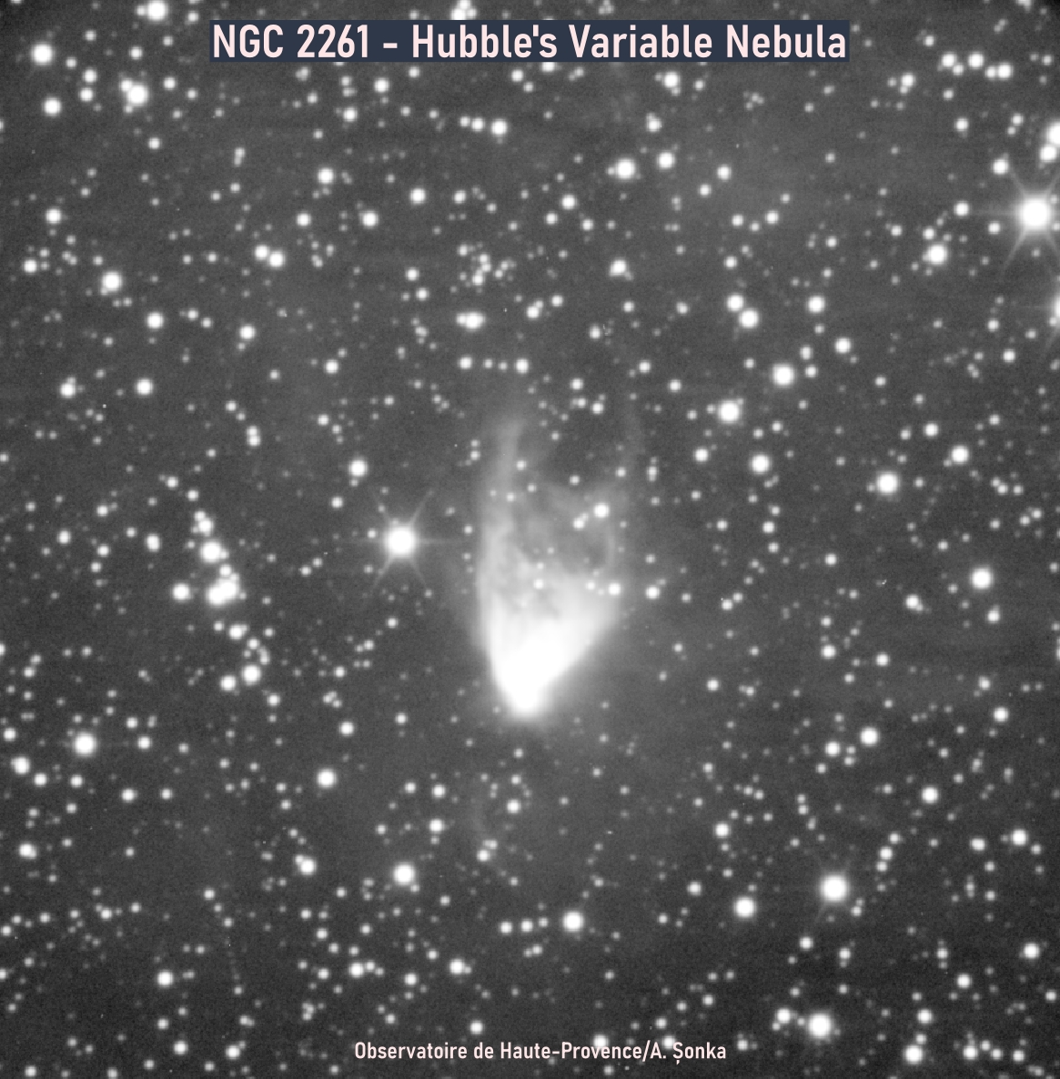 Partea difuză din preajma stelei se numește nebuloasa variabilă a lui Hubble și este străbătută de niște regiuni întunecate. Din ce știm noi acum, zonele întunecate sunt de fapt umbrele lăsate de alți nori care se interpun între stea și nebuloasă.
